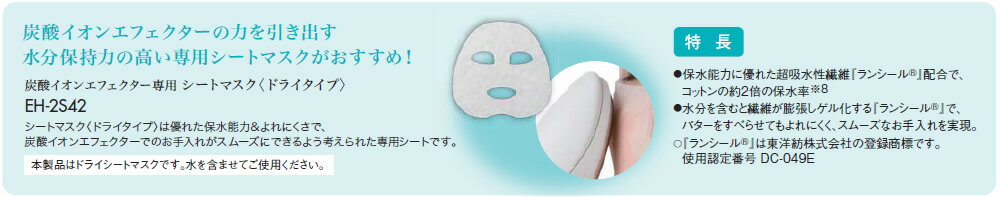 炭酸イオンエフェクターの力を引き出す水分保持力の高い専用シートマスクがおすすめ!特長●保水能力に優れた超吸水性繊維『ランシール?』配合で、コットンの約2倍の保水率●水分を含むと繊維が膨張しゲル化する『ランシール?』で、パターをすべらせてもよれにくく、スムーズなお手入れを実現。